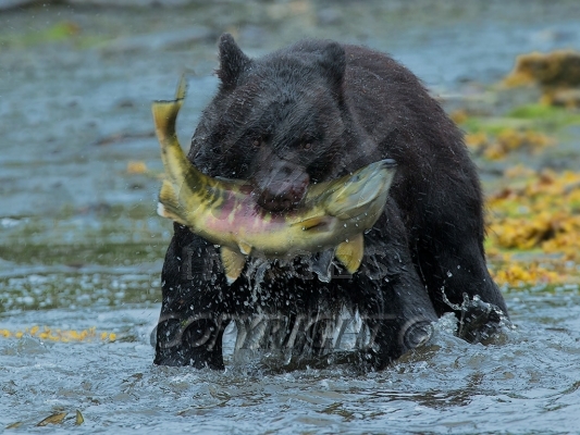 Black Bear securely grabbing Pink Salmon with both front claws and mouth _GS19056