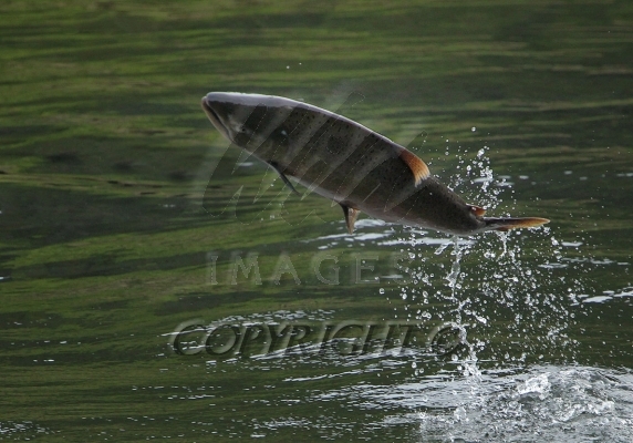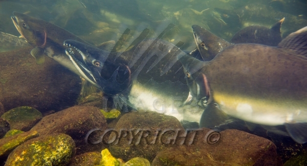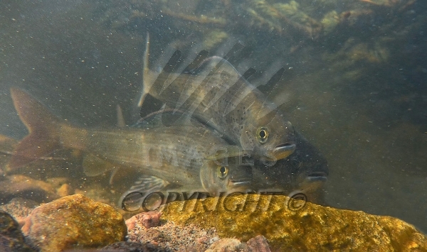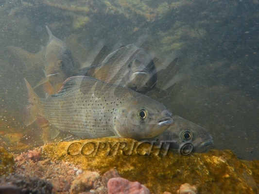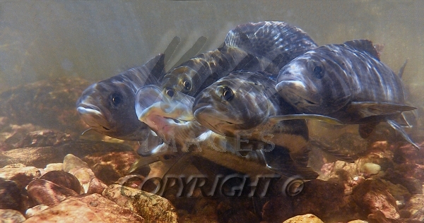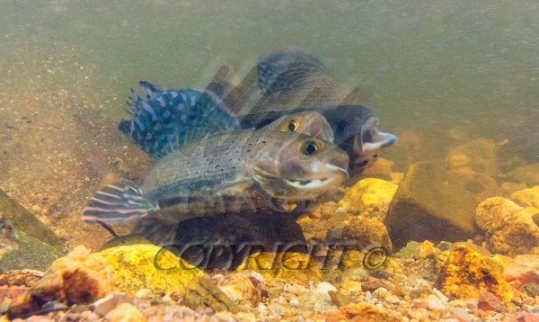 Four Arctic Grayling form a tight cluster as they migrate upstream during the annual spawning run DSC_3496