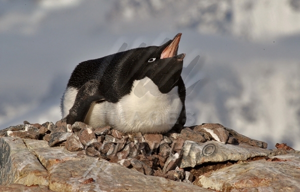 Adelie Penguin yawns while sitting on rock nest 0R7E5097