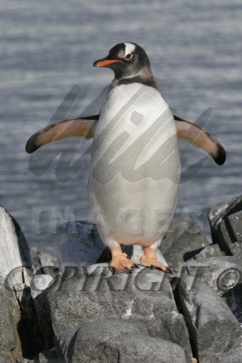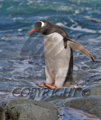 Gentoo Penguin leaping from rock to rock 0R7E4136