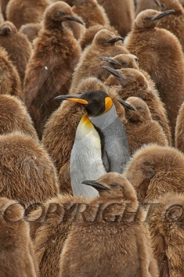 King Penguin adult surrounded by chicks 0R7E2871