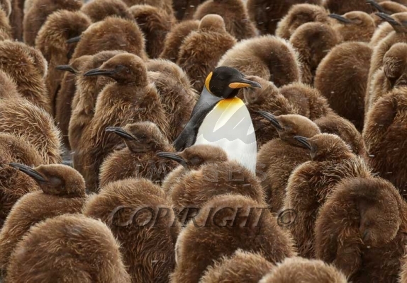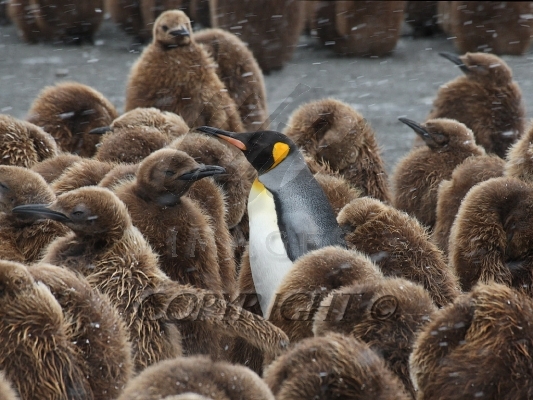 King Penguin adult surrounded by Oakum Boys-jouvenile King Penguins 0R7E2714