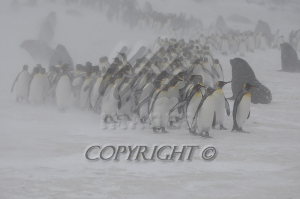 King Penguins march to the sea with katabatic winds swirling snow around 0R7E1741