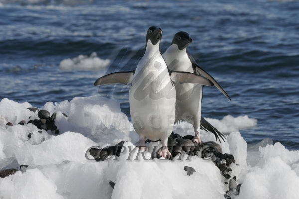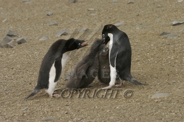 Adelie Penguin feeding ravenous chicks another adult watches Aptenodytes patagonicus CS Antarctica 04200-00110