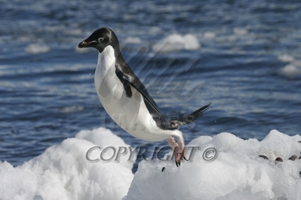 Adelie Penguin jumps from ice block to ice block Aptenodytes patagonicus CS Antarctica 04200-00104