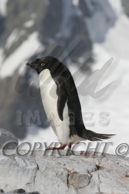 Lonely Adelie Penguin at colony with Antarctic glacier in back Aptenodytes patagonicus CS Antarctica 04200-00111