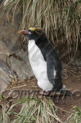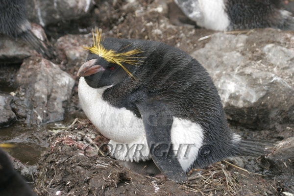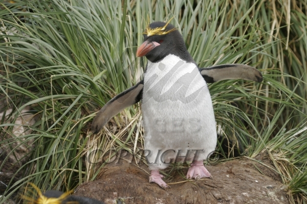 Rockhopper Penguin hopping with nesting material in mouth 0R7E8803