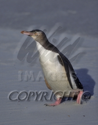 Yellow-eyed Penguin kicks up sand as it crosses a New Zealand beach 09480-01008